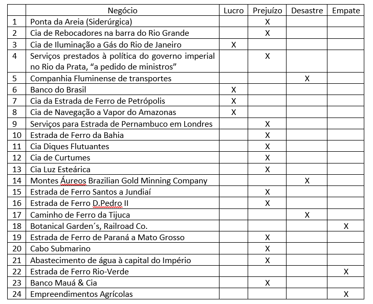 Em 32 anos de trabalho depois que saiu de seu emprego na empresa Comercial Importadora / Exportadora Inglesa, Mauá fez questão de citar e detalhar nesta sua obra 24 negócios, mas ainda assim, conforme o próprio autor (Mauá) e Claudio Ganns, essa não é uma lista completa. Alguns negócios como por exemplo a construção do Canal do Mangue ficaram de fora.